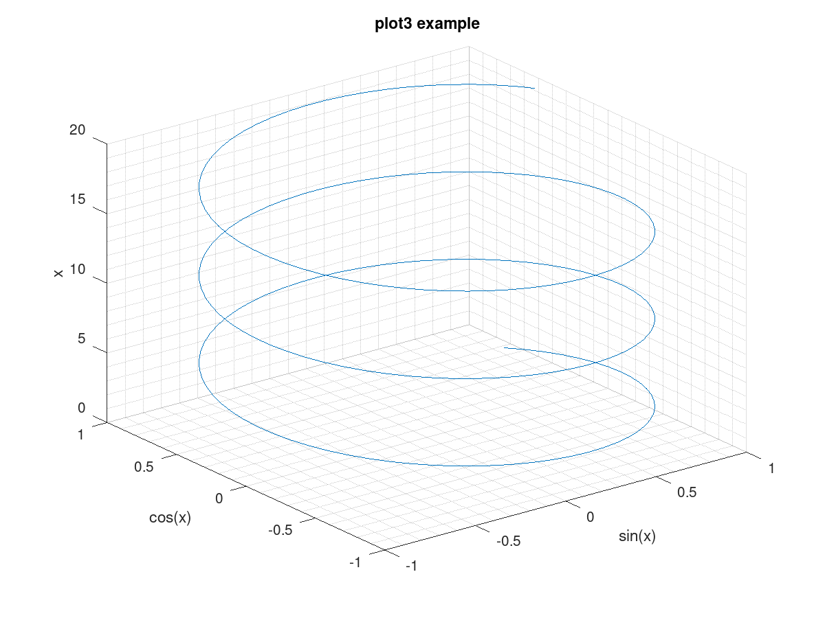 x = linspace(1,20,200); y = sin(x); z = cos(x); fig = figure(); plot3(y,z,x); % 3 dimentioanl plotting xlabel("sin(x)"); ylabel("cos(x)"); zlabel("x"); grid on; grid minor on; title("plot3 example");